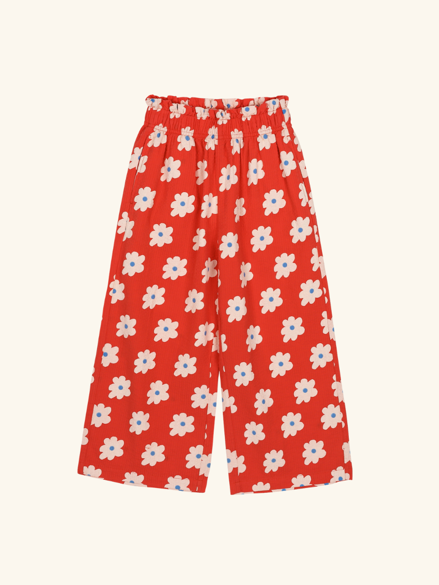 Red cotton wide-leg pants with all-over white daisy print, by Korean kids brand Jelly Mallow.