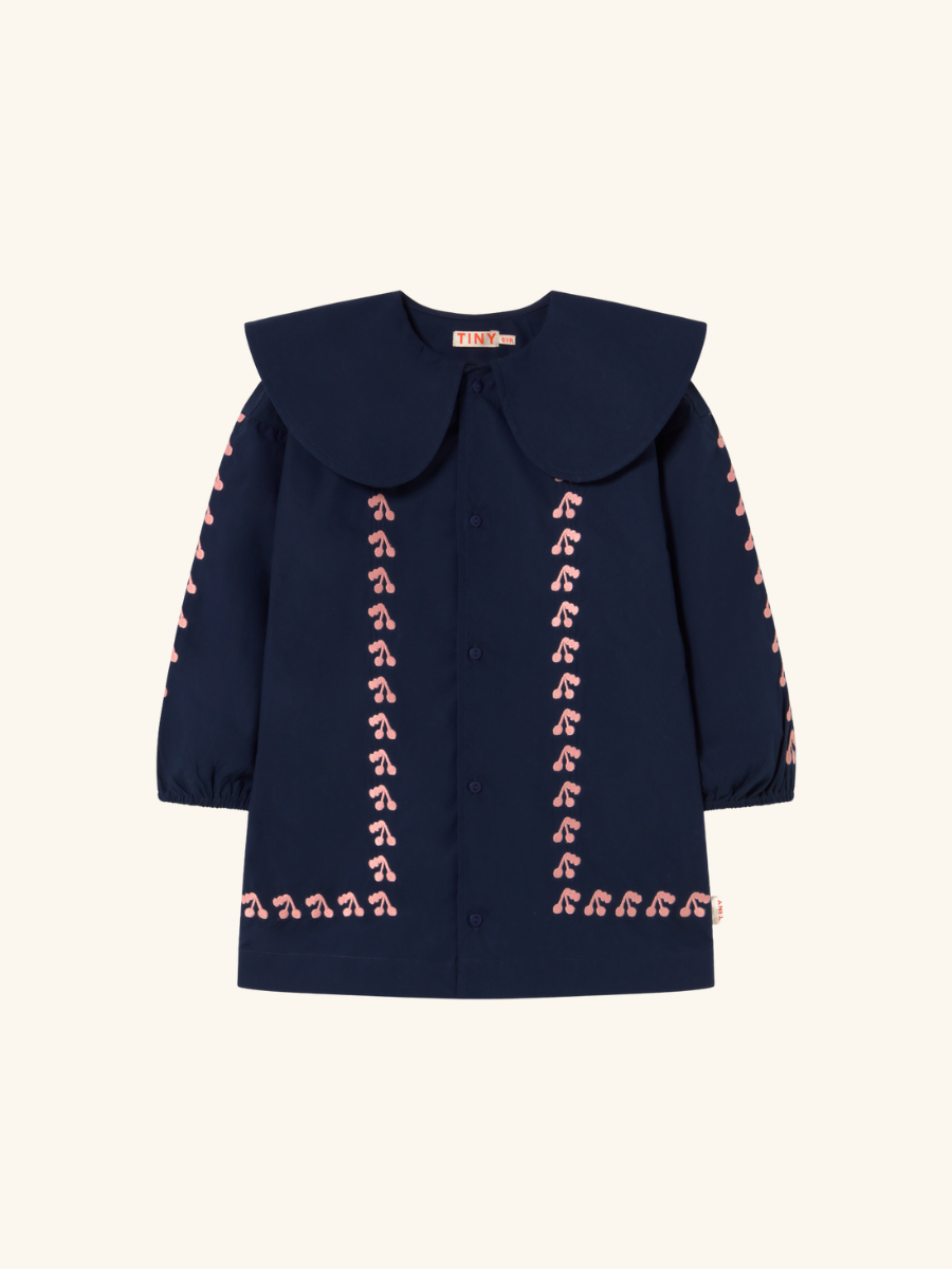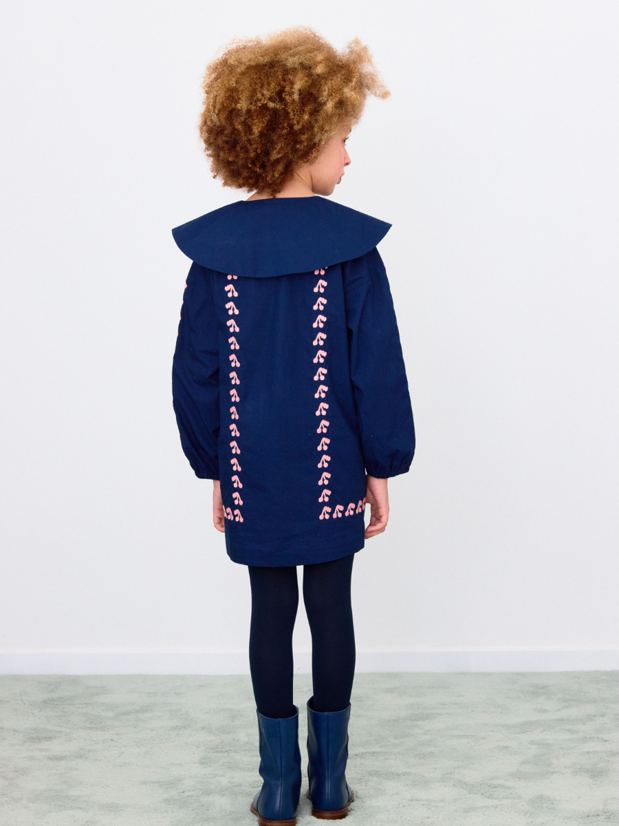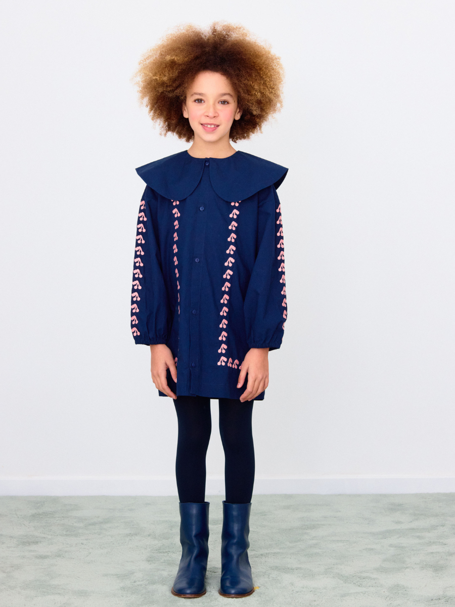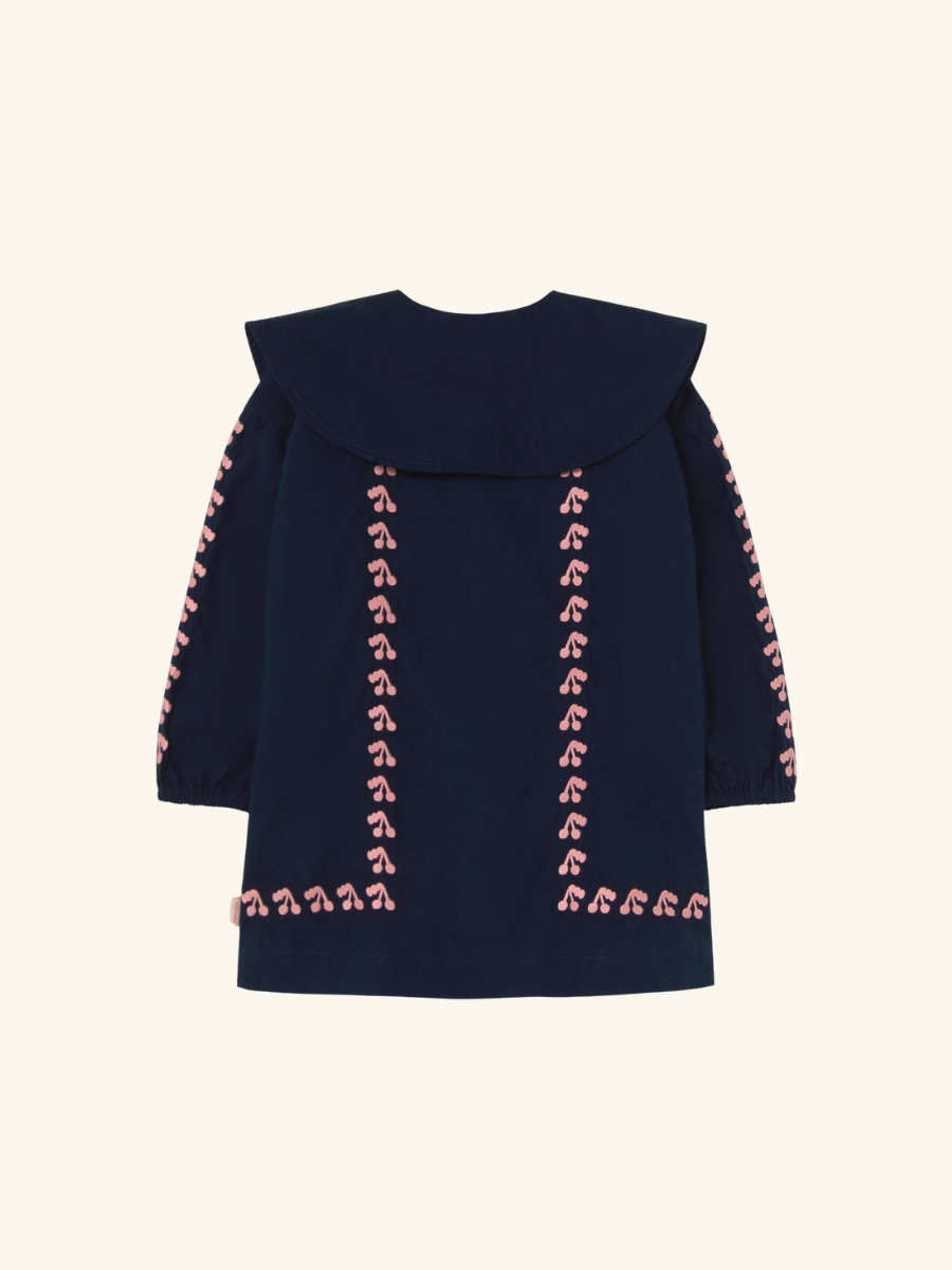 Navy cotton dress adorned with tiny cherry embroideries, by Spanish kids brand Tiny Cottons.