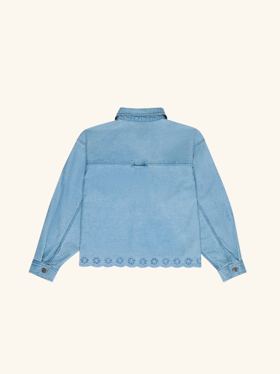 Lightweight denim jacket with embroidered hem details, by Spanish kids brand The New Society.