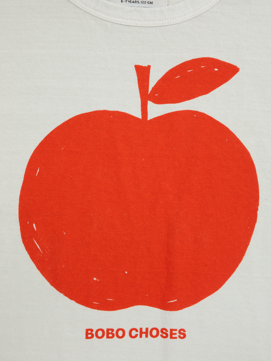 Classic crewneck with short sleeves and a bold red apple graphic on the front.